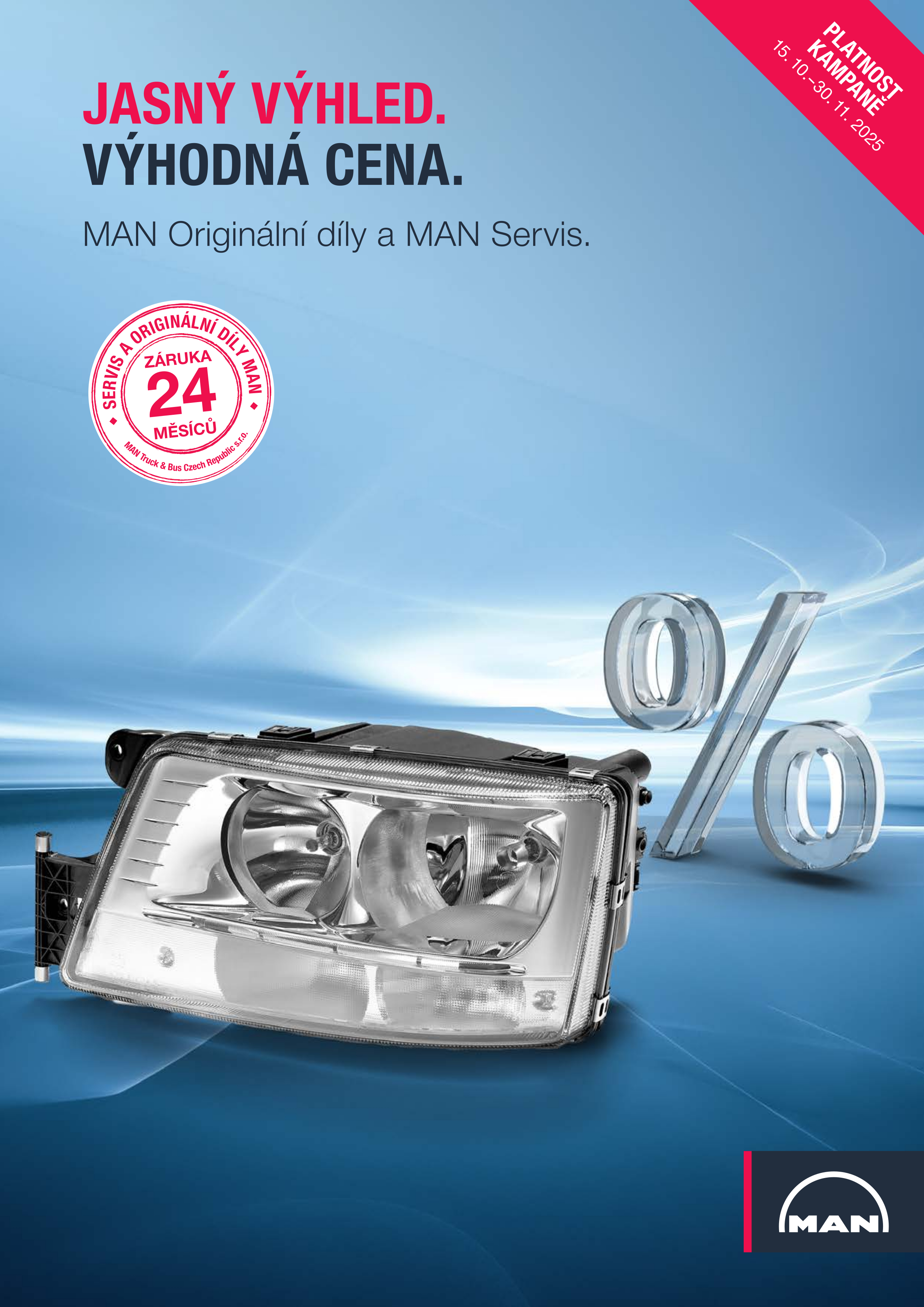 Během trvání kampaně můžete využít atraktivní cenové výhody na originální díly MAN, maximální přínosy a minimalizované náklady se vyplatí. Využijte příležitosti a seznamte se s celou škálou speciálních nabídek ve vašem servisním středisku MAN.MAN ORIGINÁLNÍ DÍLY PRO OSVĚTLENÍ, AKUMULÁTORY a SYSTÉMY VYTÁPĚNÍ, MAN ORIGINÁLNÍ PŘÍSLUŠENSTVÍ a ÚDRŽBU